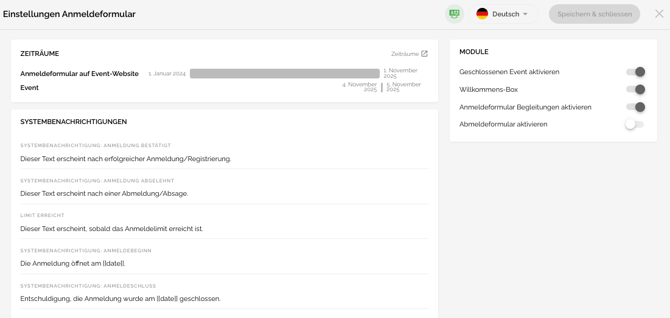 Wenn du die Platzhalter [[event.register]] oder [[event.personalsite]] in deinen Nachrichten verwendest, verlinken diese auf die deklarierte Standard-Website. Der Baustein "Anmeldung" muss daher auf der Standard-Website enthalten sein.