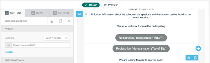 Click on a text to open the formatting bar. There you can, for example, set the font, font size and alignment of the text or insert links. You will also find the placeholder manager here, which you can use to insert all the placeholders available in the event into your message. You can find more information about placeholders in this article.